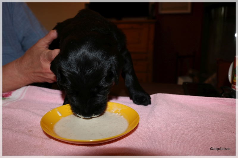 Am Sonntag gab es für die Kleinen die erste Welpenmilch, angedickt mit ein bisschen Schmelzflocken. Jedem einzelnen wurde der leckere Brei auf einem Tellerchen angeboten und 4 haben auch sofort verstanden, wie schlecken geht und so war die kleine Probeportion im Nu weg.