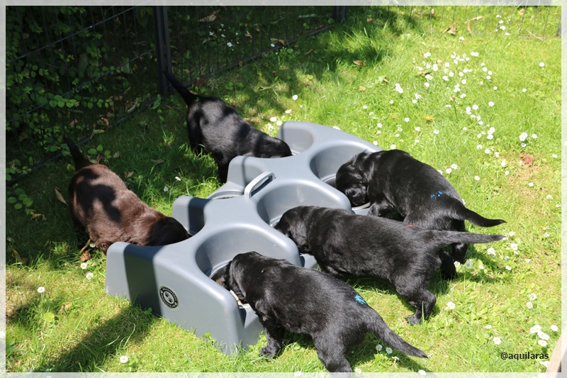 In den letzten Tagen habe ich die Kleinen nach und nach auf 4 kleine Mahlzeiten Puppyfutter umgestellt. Sie fressen es mit großem Eifer und vertragen es sehr gut. Das bedeutet aber für Ebba (leider) weniger zu fressen im Napf, damit sie nicht mehr soviel Milch „produziert“. Glücklich ist sie nicht darüber, aber ich versuche sie ein wenig zu trösten, mit der Aussicht auf prallgefüllte Näpfe in ca. 3 Wochen…