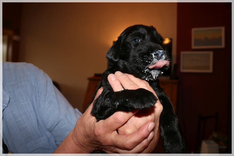 Am Sonntag gab es für die Kleinen die erste Welpenmilch, angedickt mit ein bisschen Schmelzflocken. Jedem einzelnen wurde der leckere Brei auf einem Tellerchen angeboten und 4 haben auch sofort verstanden, wie schlecken geht und so war die kleine Probeportion im Nu weg.