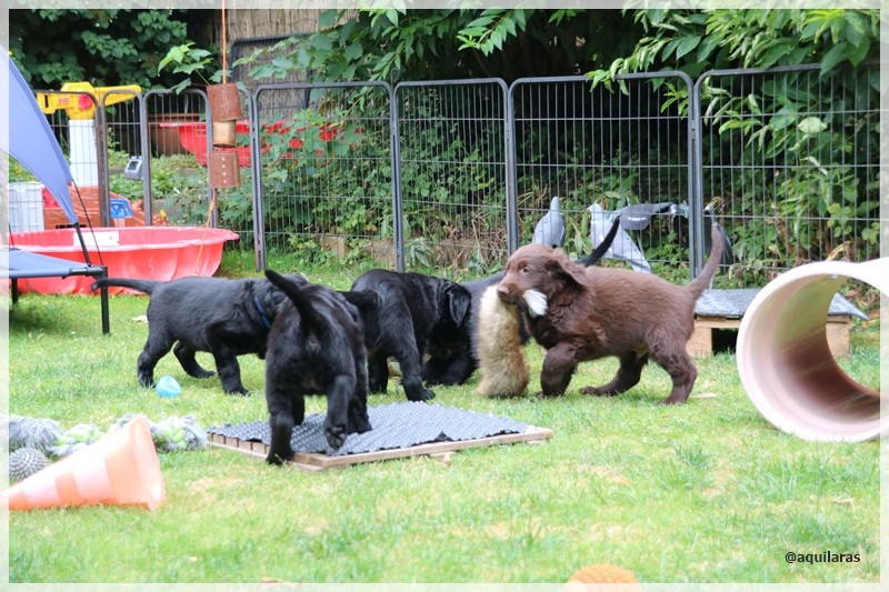 Und es gab zwei neue Hundebekanntschaften, die die Welpen knüpfen durften, natürlich mit Zaun zwischen den neugierigen Nasen. Josie, Ebbas Trainingspartnerin und Sirius, der in 3 Wochen eine kleine schwarze Begleiterin haben wird, haben den Mittwochnachmittag mit ihren Menschen bei uns verbracht.