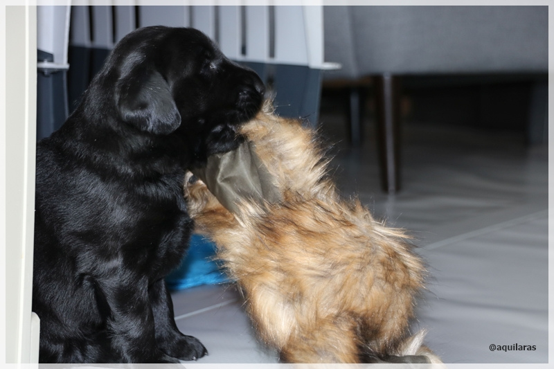 Und es gab zwei neue Hundebekanntschaften, die die Welpen knüpfen durften, natürlich mit Zaun zwischen den neugierigen Nasen. Josie, Ebbas Trainingspartnerin und Sirius, der in 3 Wochen eine kleine schwarze Begleiterin haben wird, haben den Mittwochnachmittag mit ihren Menschen bei uns verbracht.