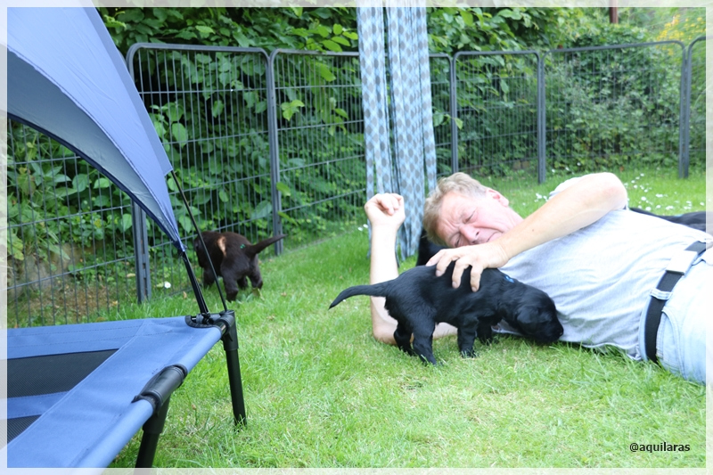 Und es gab zwei neue Hundebekanntschaften, die die Welpen knüpfen durften, natürlich mit Zaun zwischen den neugierigen Nasen. Josie, Ebbas Trainingspartnerin und Sirius, der in 3 Wochen eine kleine schwarze Begleiterin haben wird, haben den Mittwochnachmittag mit ihren Menschen bei uns verbracht.